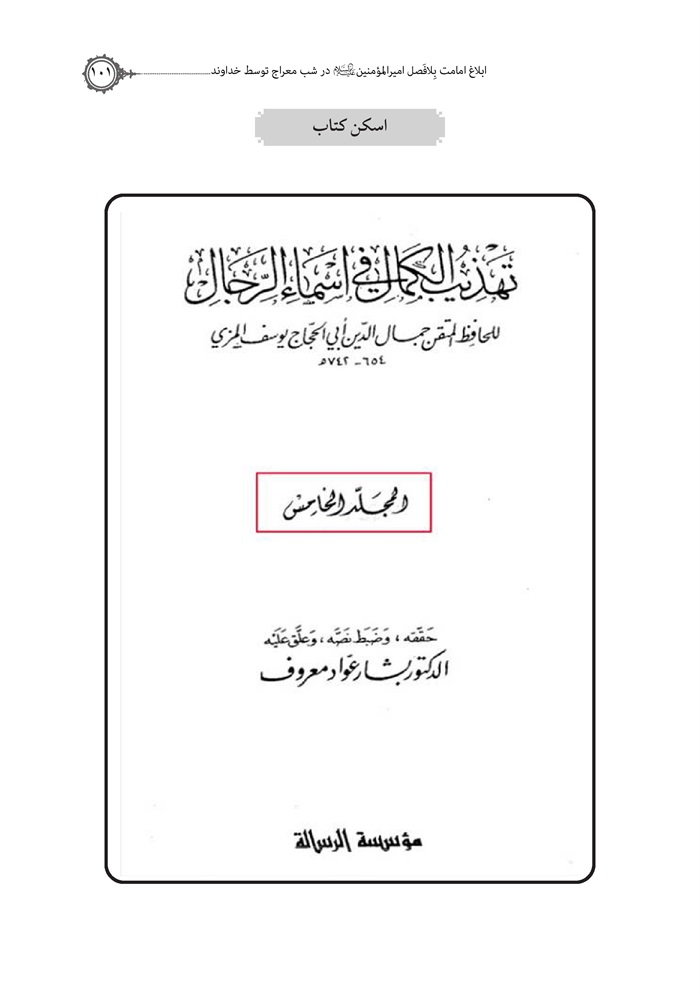 25. تهذيب الكمال في أسماء الرجال، المؤلف: يوسف بن عبد الرحمن بن يوسف، أبو الحجاج، جمال الدين ابن الزكى أبى محمد القضاعي الكلبى المزى (المتوفى: 742 ق)، المحقق: د. بشار عواد معروف الناشر: مؤسسة الرسالة - بيروت، الطبعة الأولى، 1400 - 1980، عدد الأجزاء: 35.