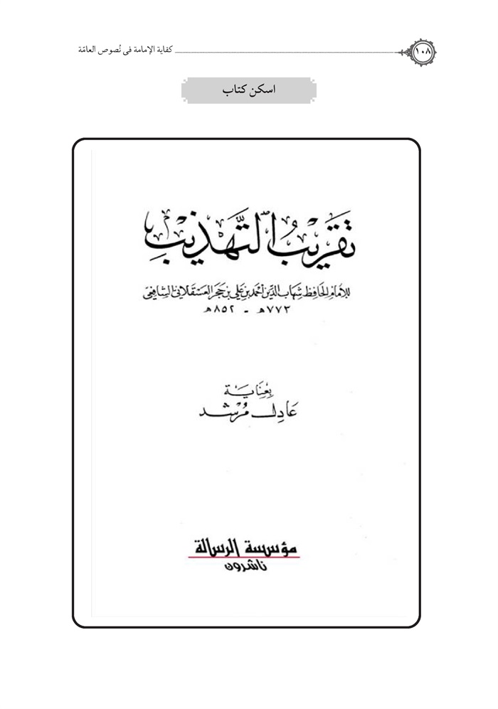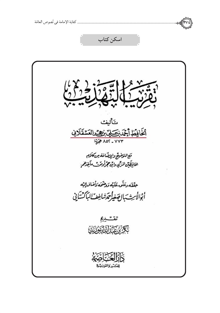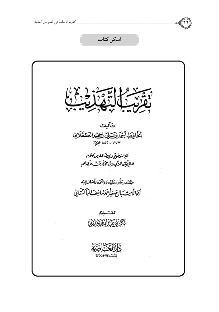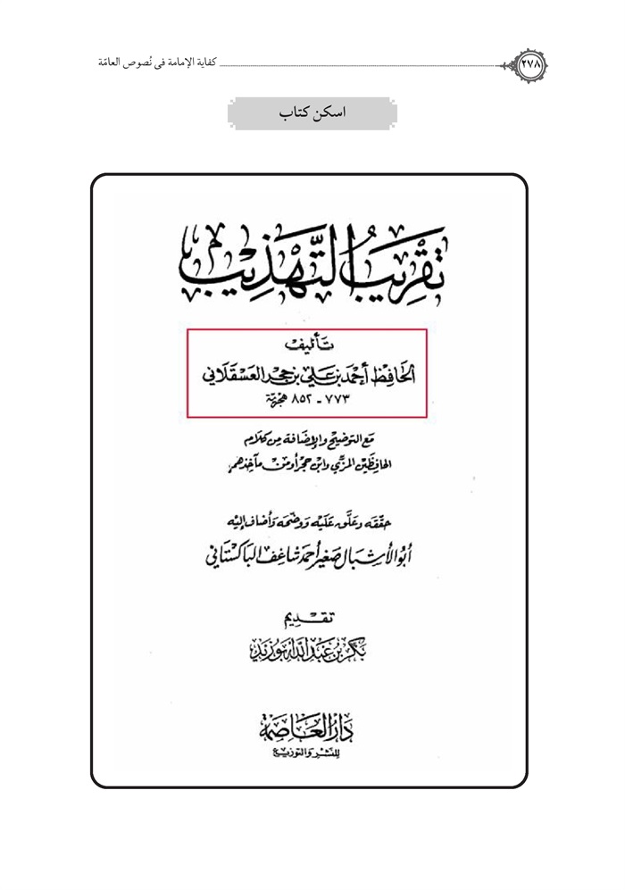 ٢٣. تقريب التهذيب، المؤلف : أبو الفضل أحمد بن علی بن محمد بن أحمد بن حجر العسقلاني (المتوفى: 852 ،ق)، المحقق: أبو الأشبال صغیر احمد شاغف الناشر: دار العاصمة - الرياض.