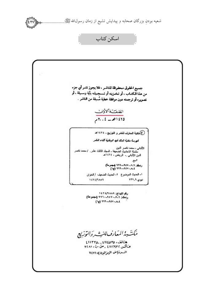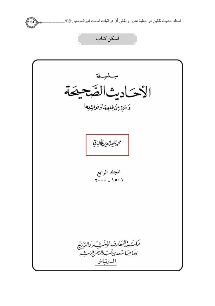 32. سلسلة الأحاديث الصحيحة وشيء من فقهها وفوائدها المؤلف: أبو عبدالرحمن محمد ناصر الدین،بن الحاج نوح الأشقودرى الألباني (المتوفی: 1420ق)، الناشر: مکتبۂ المعارف للنشر والتوزيع،الرياض، الطبعة الأولى (المكتبة المعارف)، عدد الأجزاء: 6