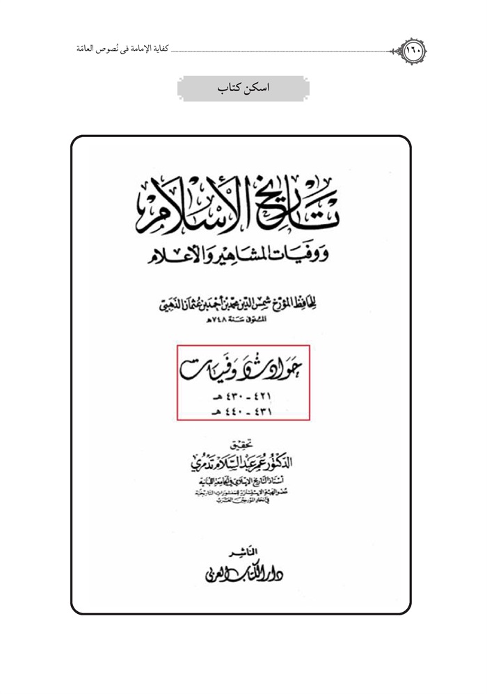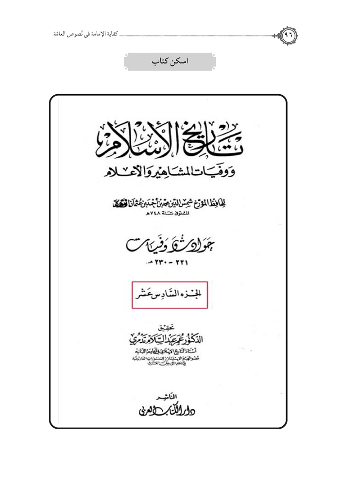 9. تاريخ الإسلام ووفيات المشاهير والأعلام المؤلف: شمس الدين أبو عبد الله محمد بن أحمد بن عثمان بن قايماز الذهبي (المتوفی 748 ق)، المحقق: عمر عبد السلام التدمري الناشر: دار الكتاب العربي بيروت، الطبعة الثانية، 1413 ق – 1993 م. عدد الأجزاء: 52.