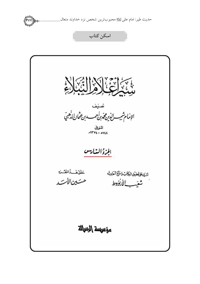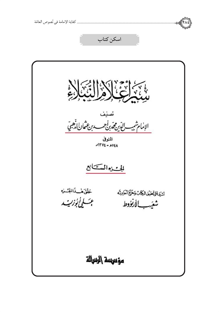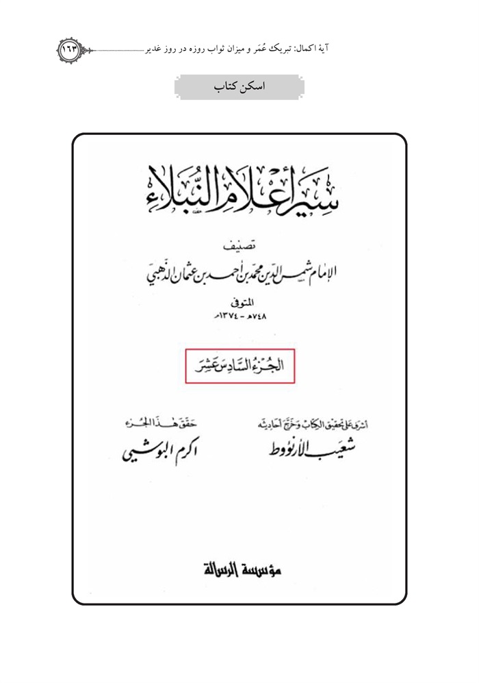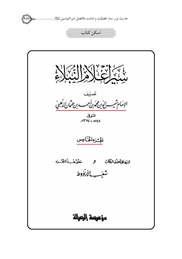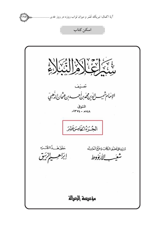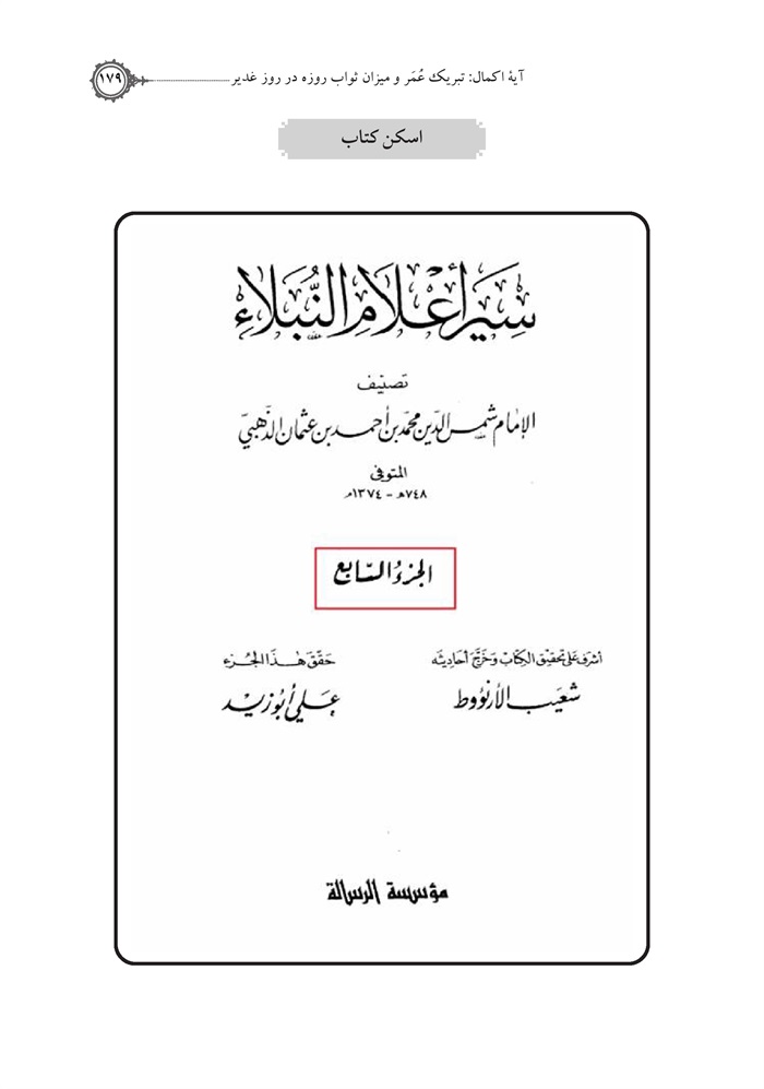 34. سیر أعلام النبلاء المؤلف : شمس الدين أبو عبد الله محمد بن أحمد بن عثمان بن قايماز الذهبي (المتوفی: 748 ق)، المحقق: مجموعة من المحققين بإشراف الشيخ شعيب الأرناؤوط، الناشر: مؤسسة الرسالة، الطبعة الثالثة ، 1405 ق / 1985م. عدد الأجزاء: 25 (23) ومجلدان فهارس).