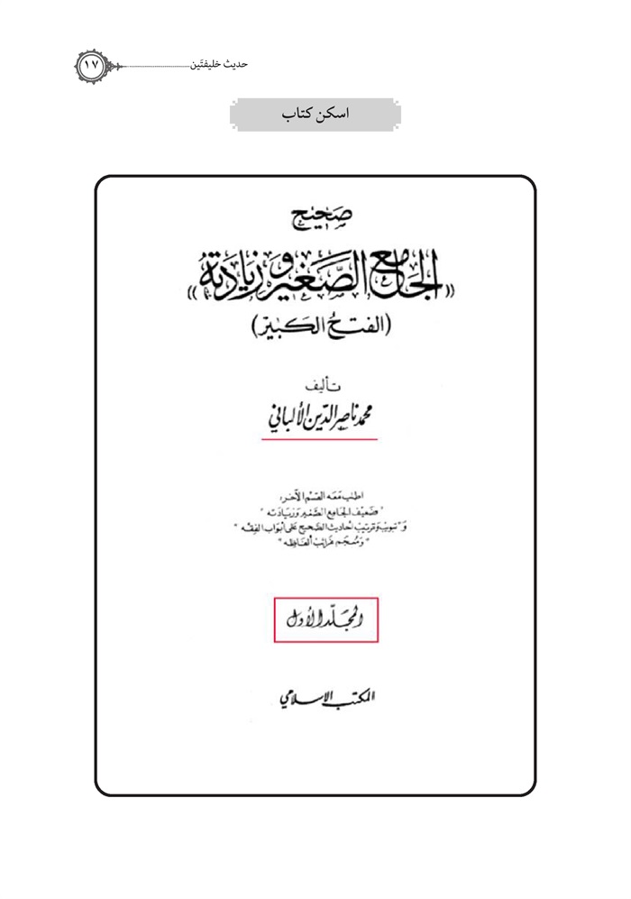 38. صحيح الجامع الصغير وزياداته، المؤلف: أبو عبدالرحمن محمد ناصر الدین، بن الحاج نوح بن نجاتی بن آدم، الأشقودرى الألباني (المتوفى: 1420 ق) الناشر: المكتب الإسلامي عدد الأجزاء: 2.