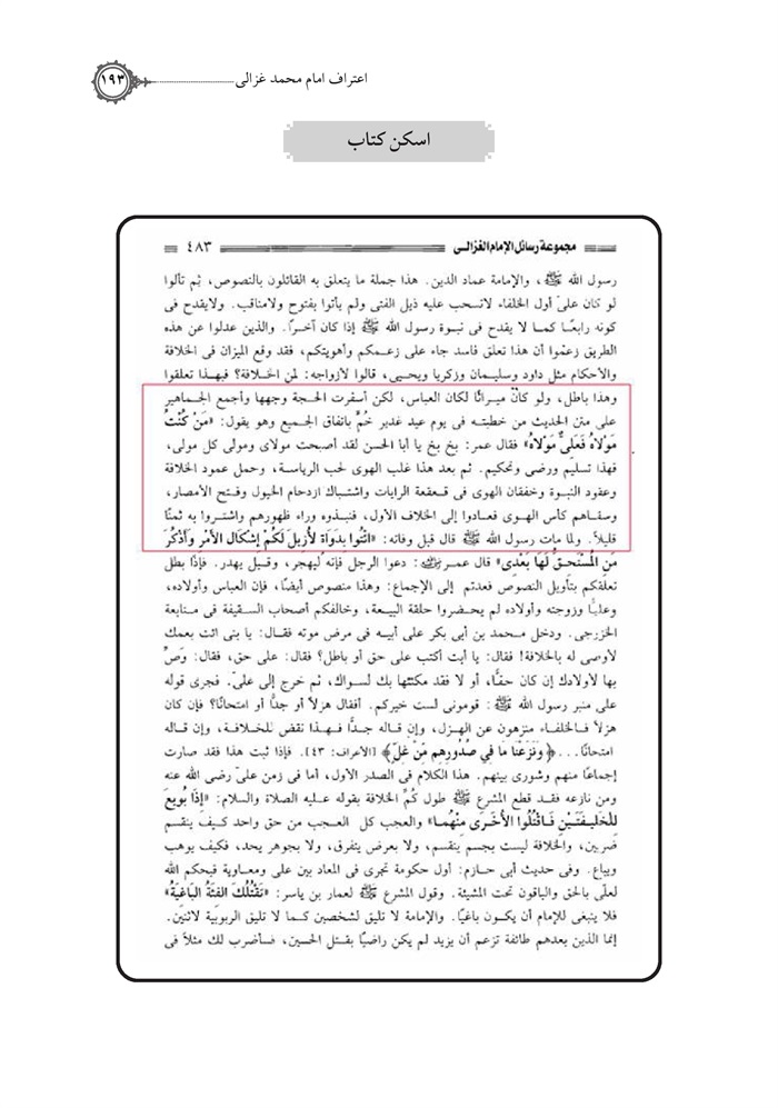 اعتراف امام محمد غزالی به امامت امیرالمؤمنین علیه السلام و بیعتشکنی و غصب