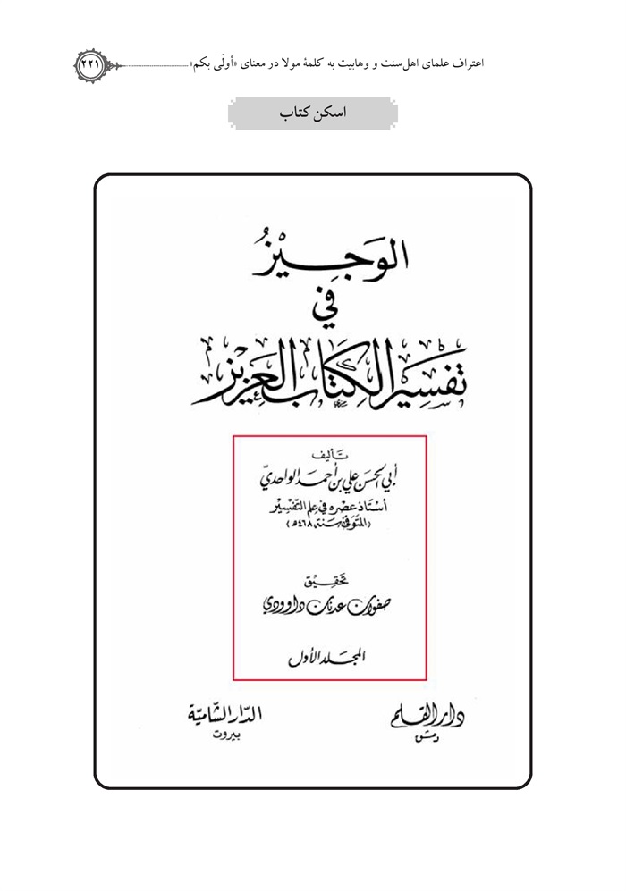 67. الوجيز فى تفسير الكتاب العزيز، المؤلف: أبو الحسن على بن أحمد بن محمد بن على الواحدى، النيسابورى، الشافعي (المتوفی: 468 ق)، تحقیق: صفوان عدنان داوودی دار النشر: دار القلم, الدار الشامية - دمشق، بيروت، الطبعة الأولى، 1415 ق.