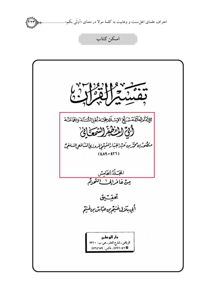 19. تفسير القرآن، المؤلف : أبو المظفر منصور بن محمد بن عبد الجبار ابن أحمد المروزى السمعانى التميمي الحنفي ثم الشافعي (المتوفى: 489 ق) ، المحقق: ياسر بن إبراهيم و غنيم بن عباس بن غنيم، الناشر: دار الوطن الرياض - السعودية، الطبعة الأولى، 1418 ق - 1997م.