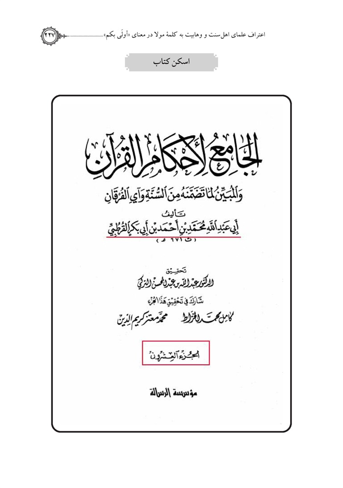 27. الجامع لأحكام القرآن – تفسير القرطبي، المؤلف: أبو عبد الله محمد بن أحمد بن أبي بكر بن فرح الأنصاري الخزرجي شمس الدين القرطبي (المتوفى: 671 ق)، تحقیق: الدكتور عبد الله بن عبد المحسن التركى و...، الناشر: موسسة الرسالة بيروت لبنان.