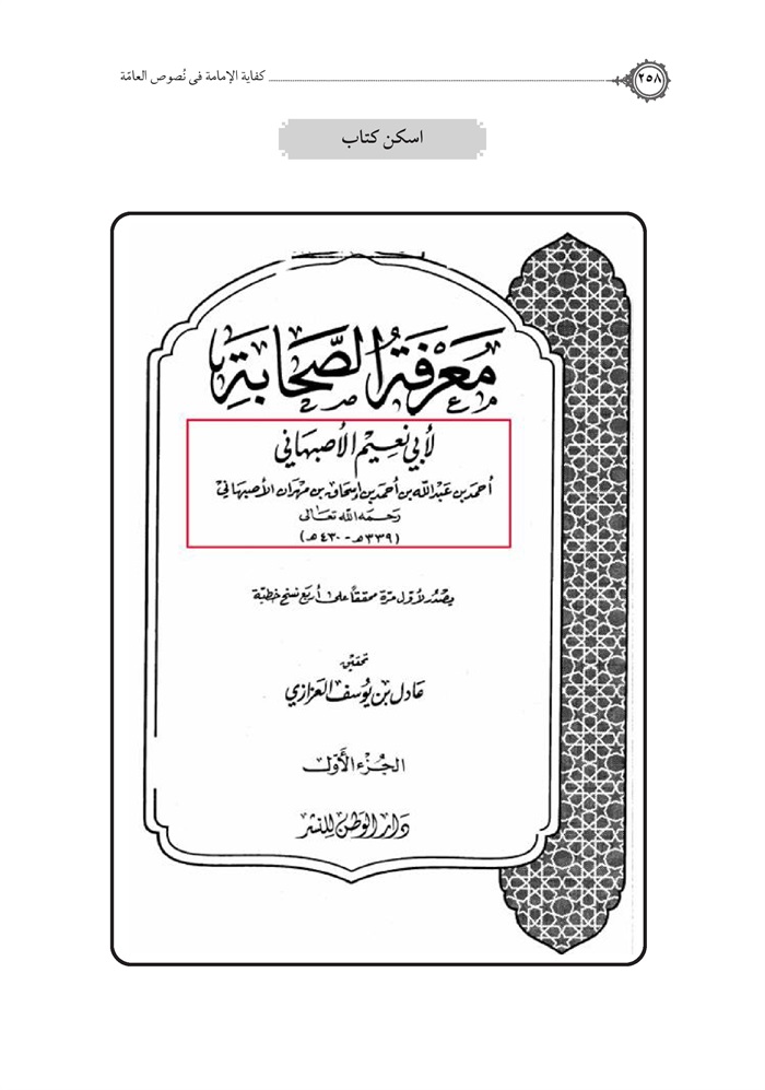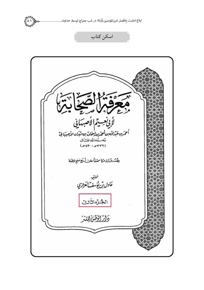 64. معرفة الصحابة، المؤلف: أبو نعيم أحمد بن عبد الله بن أحمد بن إسحاق بن موسى بن مهران الأصبهاني (المتوفی: 430 ق)، تحقيق: عادل بن يوسف العزازي الناشر : دار الوطن للنشر، الرياض، الطبعة الأولى 1419 ق - 1998م. عدد الأجزاء: عدد عدد الأجزاء: عدد الأجزاء: 7 (6 أجزاء ومجلد فهارس).