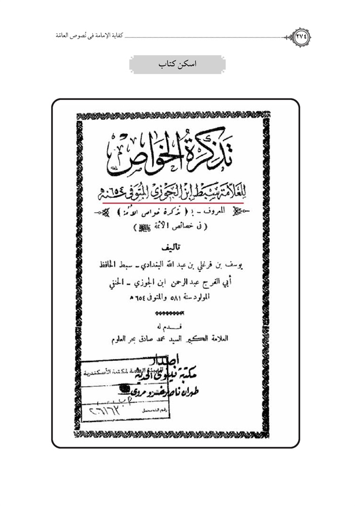 ١٣. تذكرة الخواص المؤلف : يوسف بن فرغلی بن عبد الله البغدادى الحنفى سبط بن الجوزى (المتوفى: 654 ق).