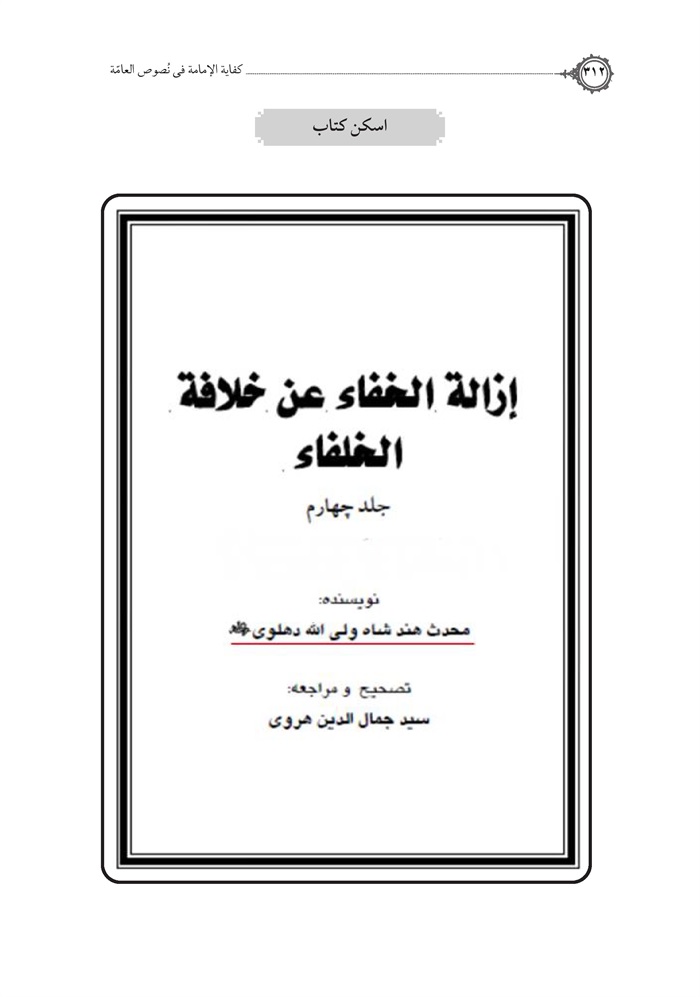 2. إزالة الخفاء عن خلافة الخلفاء ترجمه فارسی)، المؤلف : ولى الله الدهلوى (المتوفى: 1176 ق) .