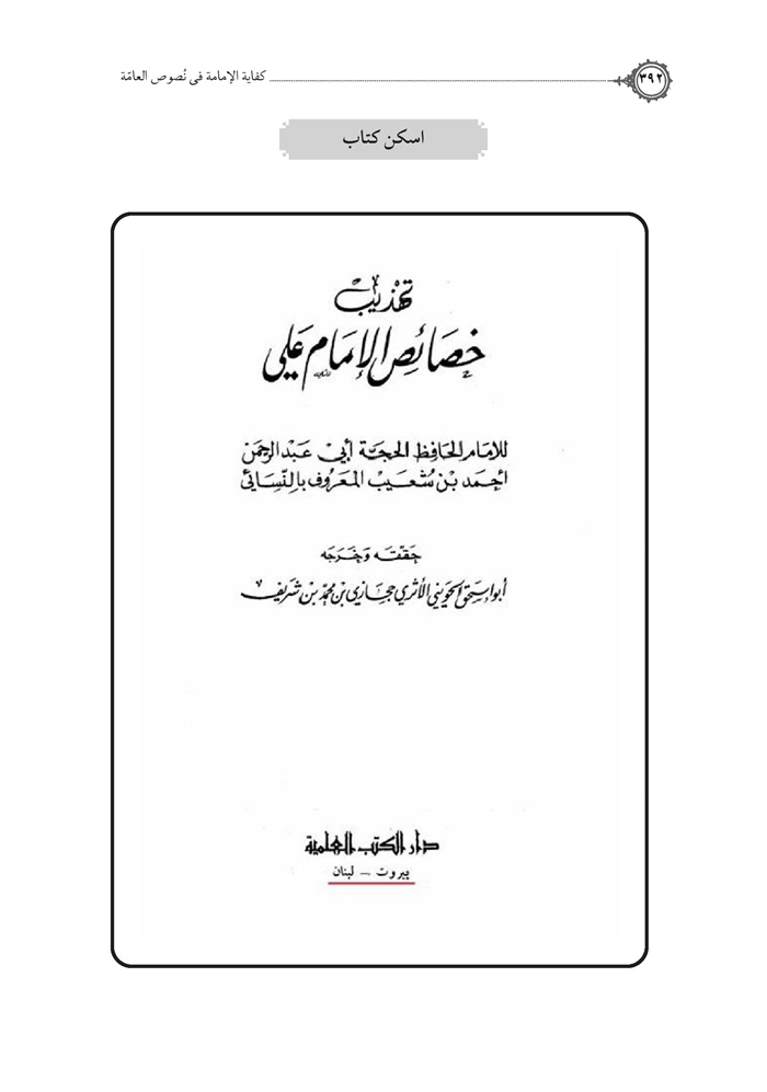 29. خصائص امام على المؤلف: أبو عبد الرحمن أحمد بن شعيب بن على الخراساني، النسائي (المتوفى: 303 ق) ، المحقق: ابو اسحق الأثرى حجازى بن محمد بن شریف، الناشر: دار الكتب العلمية -بيروت- لبنان.