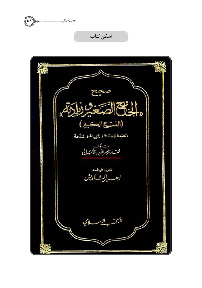 ٣٩. صحيح الجامع الصغير وزياداته، المؤلف: أبو عبدالرحمن محمد ناصر الدين بن الحاج نوح، الأشقودرى الألباني (المتوفى: 1420) ،ق)، الناشر: المكتب الإسلامي.