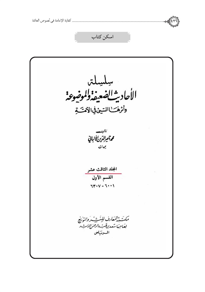 33. سلسلة الأحاديث الضعيفة والموضوعة وأثرها السيئ فى الأمة، المؤلف : أبو عبد الرحمن محمد ناصر الدین بن الحاج نوح بن نجاتی بن آدم الأشقودرى الألباني (المتوفی: 1420 ق)، دار النشر: دار المعارف، الرياض - الممكلة العربية السعودية، الطبعة الأولى، 1412ق/1992م. عدد الأجزاء: 14.