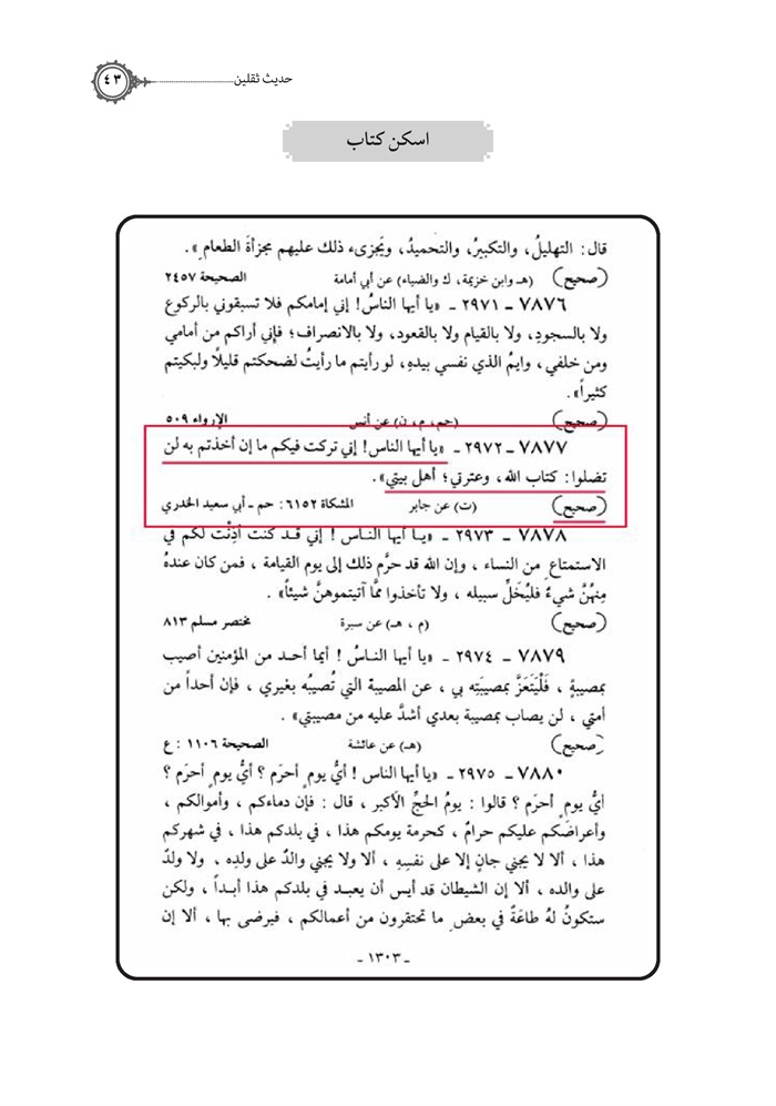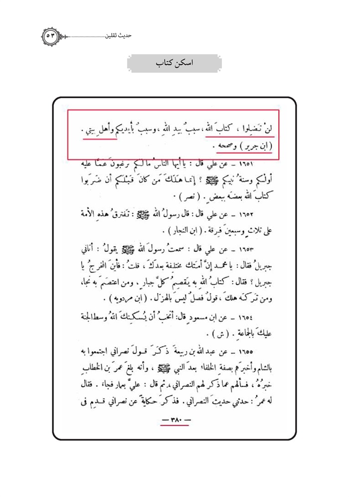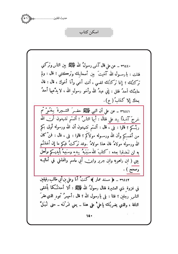 حدیث ثقلَین (دستور پیامبر اکرمصلی الله علیه واله به پیروی از امام علی علیه السلام برای جلوگیری از انحراف تا روز قیامت)33