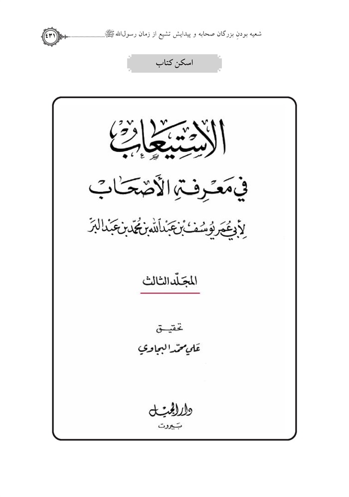 3. الاستيعاب في معرفة الأصحاب المؤلف: أبو عمر يوسف بن عبد الله بن محمد بن عبد البر بن عاصم النمرى القرطبي (المتوفى: 463 ق)، المحقق: علی محمد البجاوي، الناشر: دار الجیل، بیروت الطبعة الأولى، 1412 ق - 1992 م. عدد الأجزاء: 4.