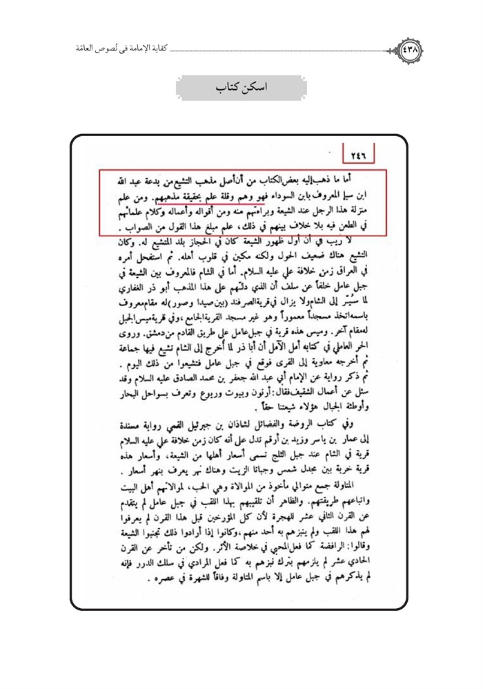 و آنچه که بعضی کتاب ها گفته اند که اصل مذهب شیعه از بدعتهای عبدالله بن سبا معروف به ابن سوداء است یک وهم و خیال است و این نشان دهندۀ کم اطلاع بودن از حقیقت مذهب تشیع است و هرکس جایگاه عبدالله بن سبا را نزد شیعیان بداند و بیزاری شان از او را در اعمال و سخنانشان و سخنان علمای شیعه در رد و طعن بر او را بداند خواهد دانست که درست این است که شیعه از زمان پیامبر وجود داشته است و هیچ شکی نیست که اولین ظهور تشیع در حجاز (عربستان) بوده است ... .