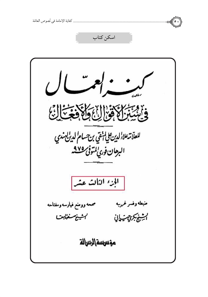 47. کنز العمال في سنن الأقوال والأفعال، المؤلف: علاء الدین علی بن حسام الدین ابن قاضی خان القادری الشاذلى الهندى البرهانفورى ثم المدنى فالمكي الشهير بالمتقى الهندى (المتوفى: 975 ق)، المحقق: بكرى حياني - صفوة السقا، الناشر: مؤسسة الرسالة، الطبعة الطبعة الخامسه، 1401 ق / 1981م.
