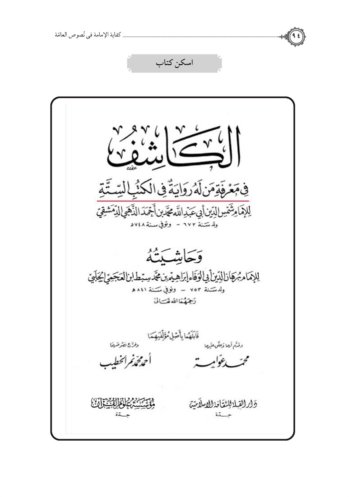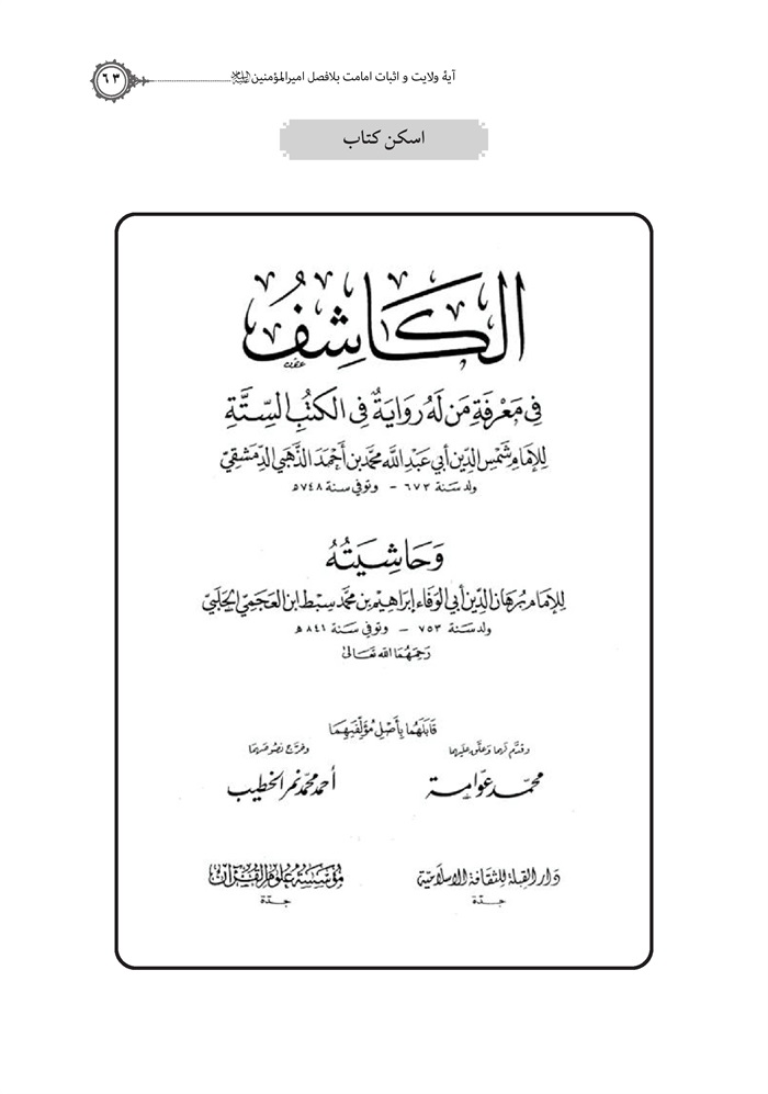 45. الكاشف في معرفة من له رواية فى الكتب الستة، المؤلف : شمس الدين أبو عبد الله محمد بن أحمد بن عثمان بن قايماز الذهبي (المتوفی: (748)،ق) ، المحقق: محمد عوامة - أحمد محمد نمر الخطيب الناشر: دار القبلة للثقافة الإسلامية - مؤسسة علوم القرآن، جدة، الطبعة الأولى، 1413 ق - 1992م.