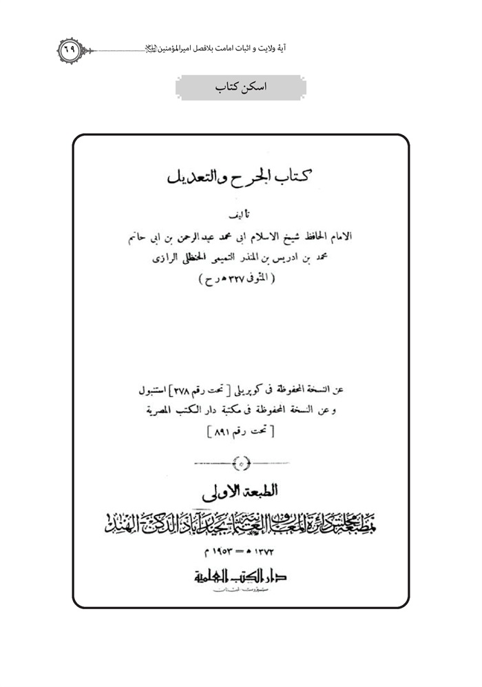 28. الجرح والتعديل المؤلف : أبو محمد عبد الرحمن بن محمد بن إدريس بن المنذر التميمي، الحنظلي، الرازي ابن أبي حاتم (المتوفى: 327 ق)، الناشر : طبعه مجلس دائرة المعارف العثمانية - بحيدر آباد الدكن - الهند، دار الكتب العلمية لبنان.