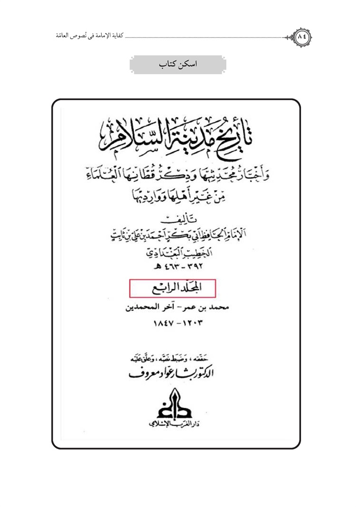 12. تاريخ بغداد، المؤلف: أبوبكر أحمد بن علی بن ثابت بن أحمد بن مهدی، الخطيب البغدادی (المتوفی: 463 ق)، المحقق: الدكتور بشار عواد معروف، الناشر: دار الغرب الإسلامى - بيروت، الطبعة الأولى 1422 ق - 2002م. عدد الأجزاء: 16.